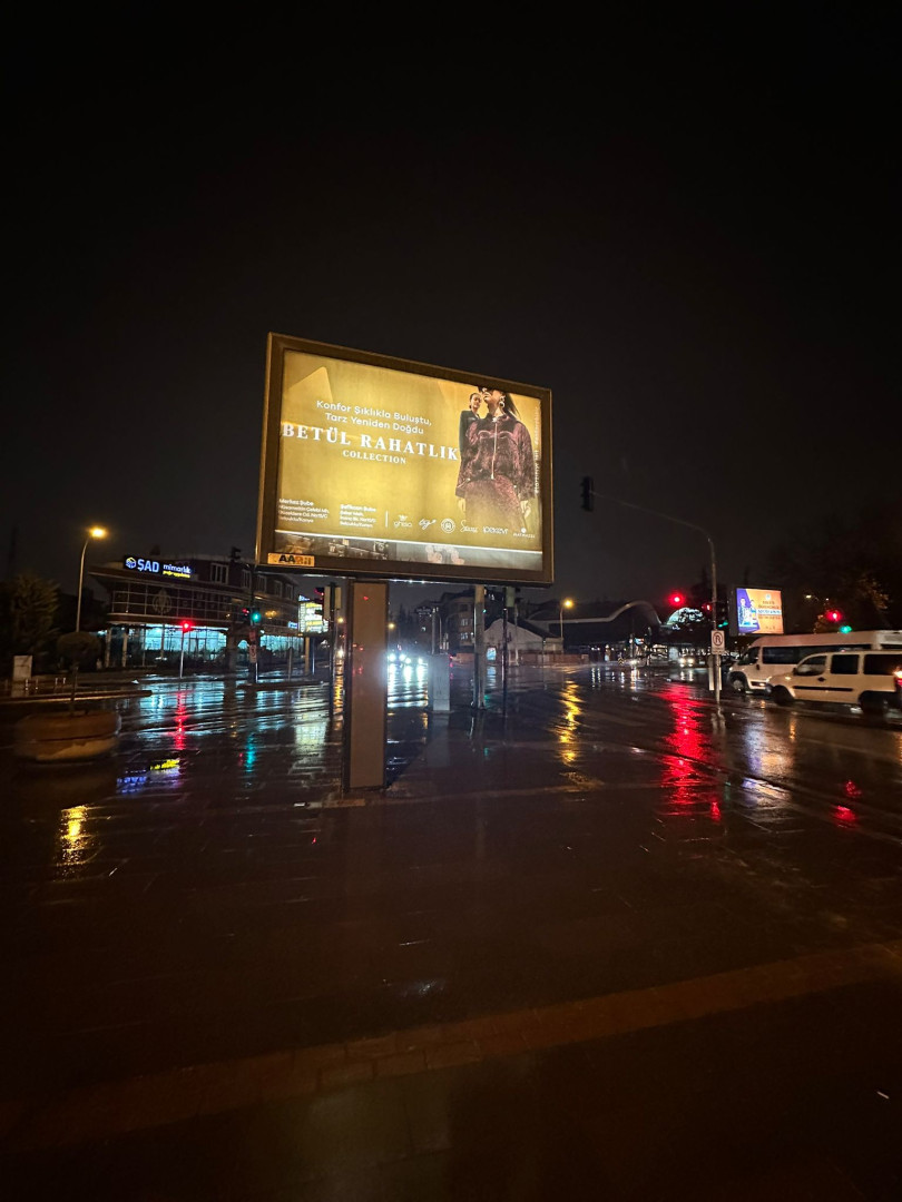 Betül Rahatlık Collection Megalight reklamlarıyla... Betül Rahatlık Collection, şehirdeki bilinirliğini artırmak için Slogan Medya ile iş birliği yaparak megalight reklamlarıyla sokakları renklendirdi.